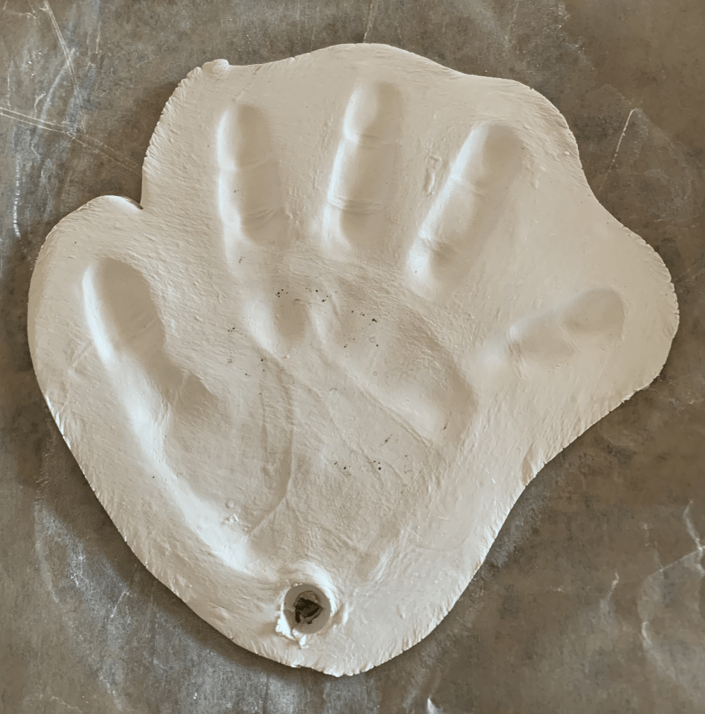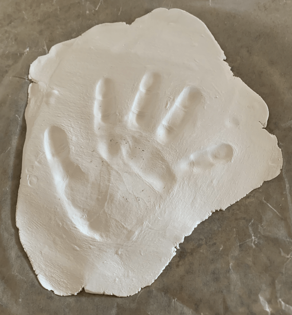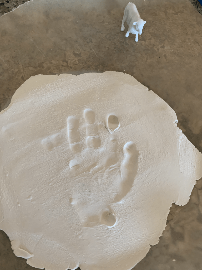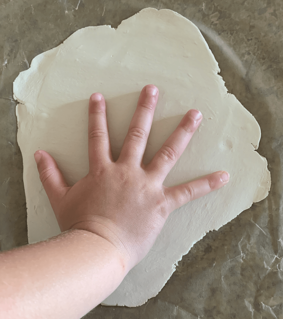 The first time we rolled it out we did so on our countertop and the clay stuck, haha. We couldn’t pry it off without ruining her handprint so we tried again using wax paper. That’s the way to go, use wax paper friends.