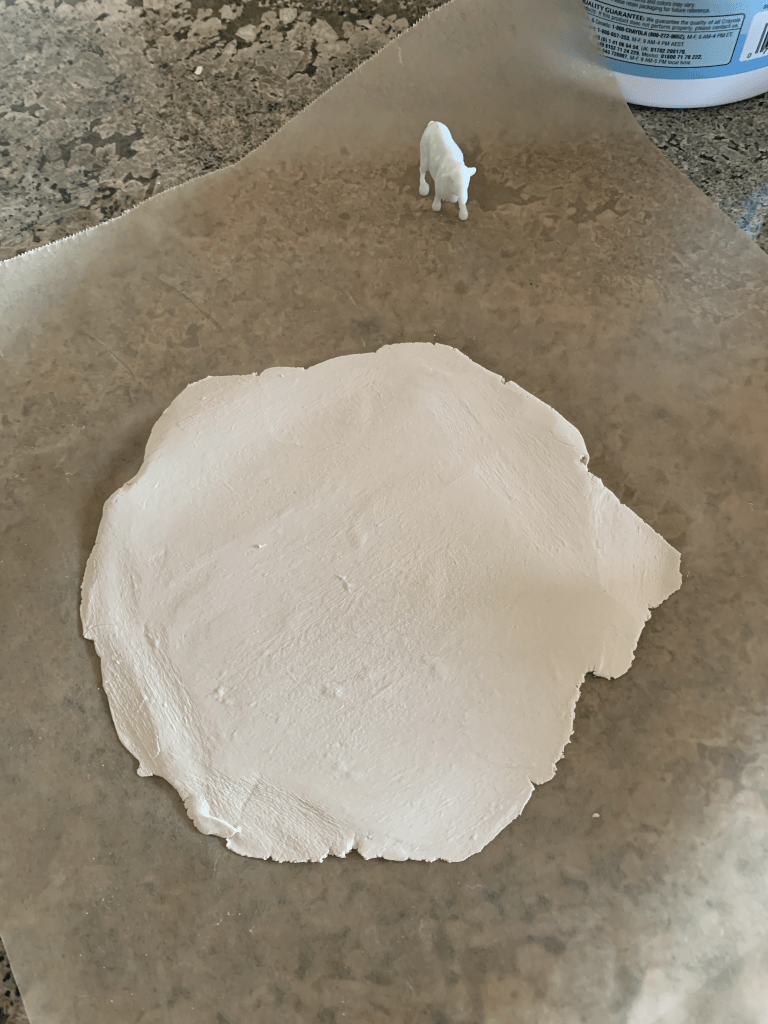 First start by rolling out the Air-Dry Clay. This is the Air-Dry Clay we used- it’s soft and easy to work with. You can get it here from Amazon* (does not come with sheep supervisor).