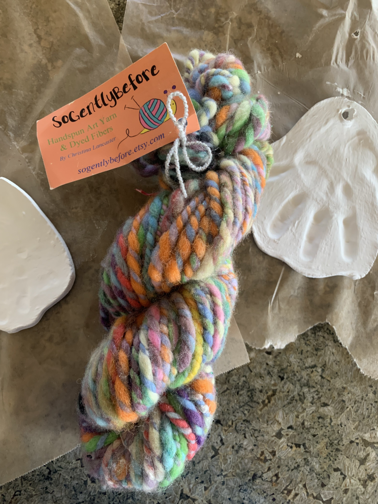 Now time to lace through your ribbon or yarn. I have some yarn I bought a long time ago at Patchwork Long Beach, when I was selling my socks monsters at craft fairs. I love this yarn. So soft and so many wonderful colors in one hank. I think I’ll eventually use the rest of it to knit something, not sure what yet, stay tuned. Even though it was years ago I remember chatting with this gal who spun the yarn and how excited she was about fiber crafts, it was so joyous talking with her. I still have her business card, so if you’re in need for some yarn please check out her etsy store, SoGentlyBefore.