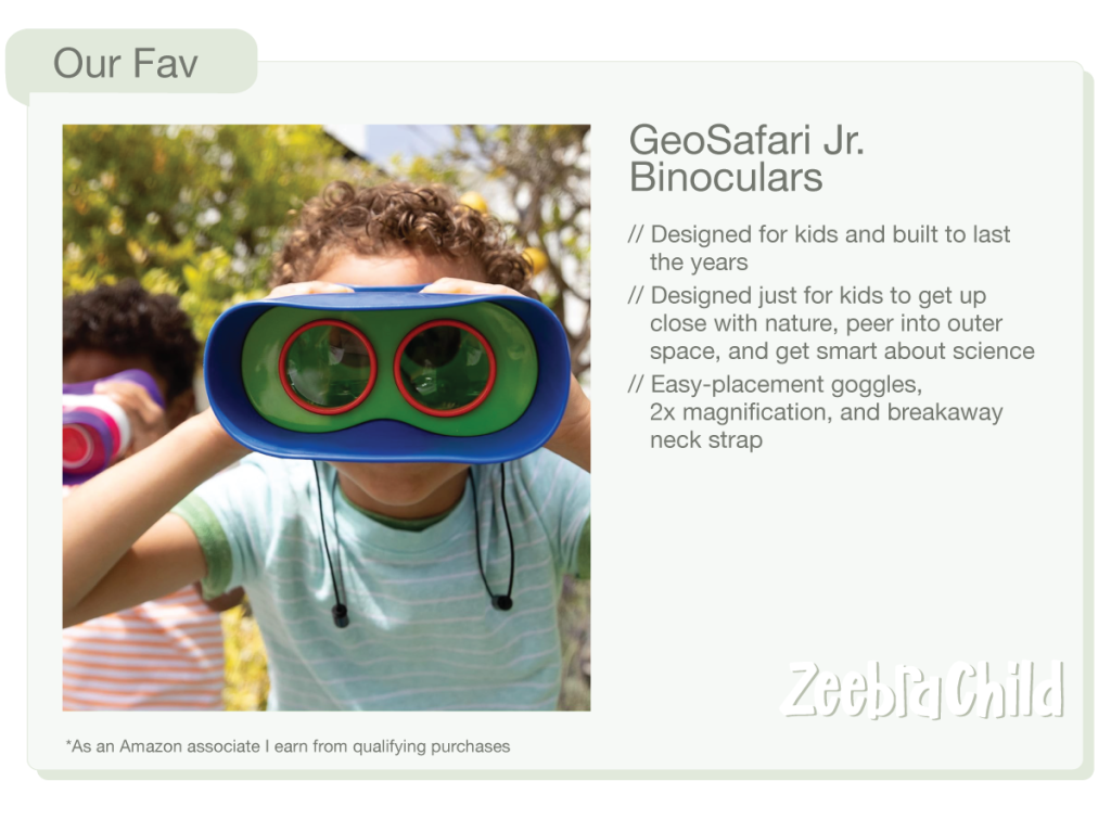 These Geo Safari Jr. binoculars are so much fun for our curious girl. She brings them on walks around the neighborhood to look up into trees and in the car to spot all the trash trucks. They are nice and light so nothing is pulling on their necks and the safety break away strap we’ll keep your minds at ease. Great way to keep them curious about the great outdoors.