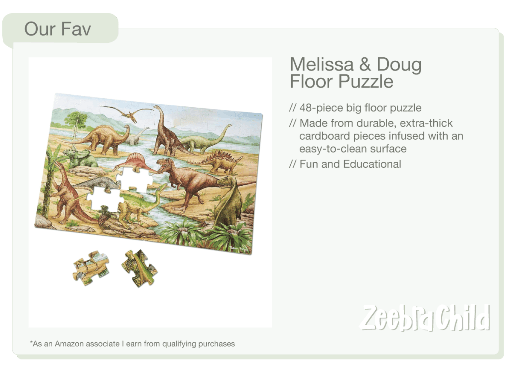 A fan favorite around these parts, this Melissa & Doug large floor puzzle is so much fun. Our daughter loves calling out the colors for the dinosaur pieces she’s looking for and its lovely to see her so proud of herself when she completes it. Nice, large and sturdy pieces easy to pick up and place in the puzzle. This one has been the subject of hours of fun.