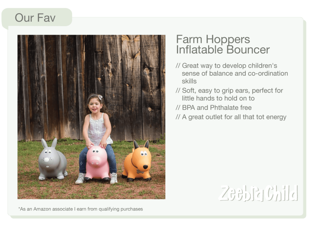 Both of our little gals (3 1/2 & 11 months) love this little Farm Hopper bouncer. We have the yellow dog that my toddler so lovingly named Cow. They both get in loads of bounce time and even cover him with a blanket so he can get his nap in. Adorable! Cow has been a favorite in the family for several years.